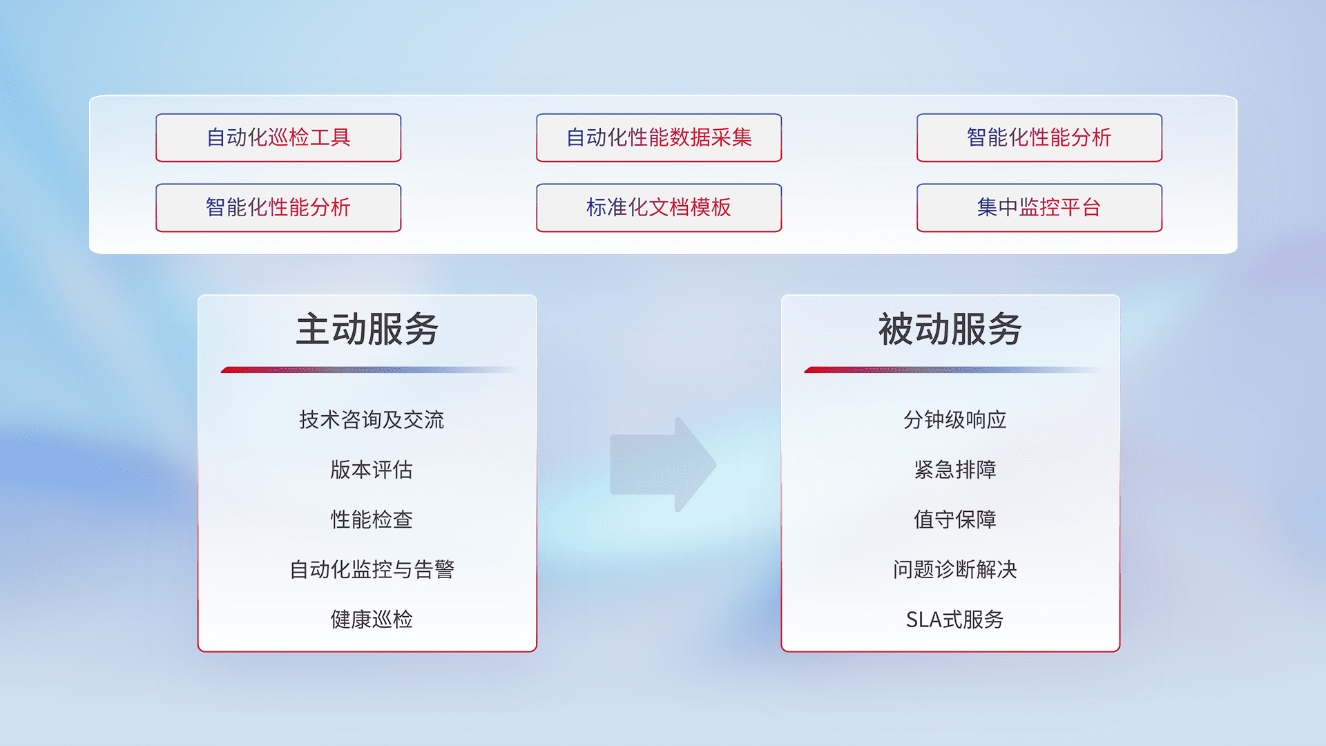 智能化工具和标准化文档,,保障服务质量,,,,提供主动服务(包含技术咨询、、、、版本评估、、、性能检查、、自动化监控与告警、、健康巡检)和被动服务包含(分钟级响应、、、紧急排障、、、、值守保障、、、问题诊断解决、、、、SLA服务)。。。